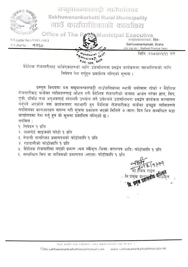 बैदेशिक रोजगारीबाट फर्किएकाहरुको लागि उद्यमशिलता प्रबर्द्धन कार्यक्रममा सहभागिताको लागि निवेदन पेश गर्नुहुन प्रकाशित गरिएको सूचना ।